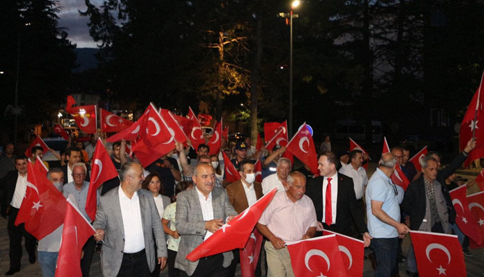 Ulus’taki Demokrasi ve Milli Birlik yürüyüşüne Abdipaşa ve Kumluca belediye başkanları da katıldı.