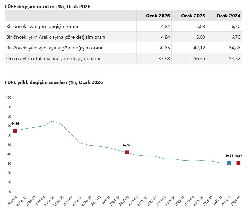TÜİK, Ocak 2026 dönemine ilişkin enflasyon verilerini açıkladı. Buna göre; tüketici fiyatları ocak ayında bir önceki aya göre yüzde 4,84, bir önceki yılın aynı ayına göre yüzde 30,65 ve 12 aylık ortalamalara göre yüzde 33,98 arttı.