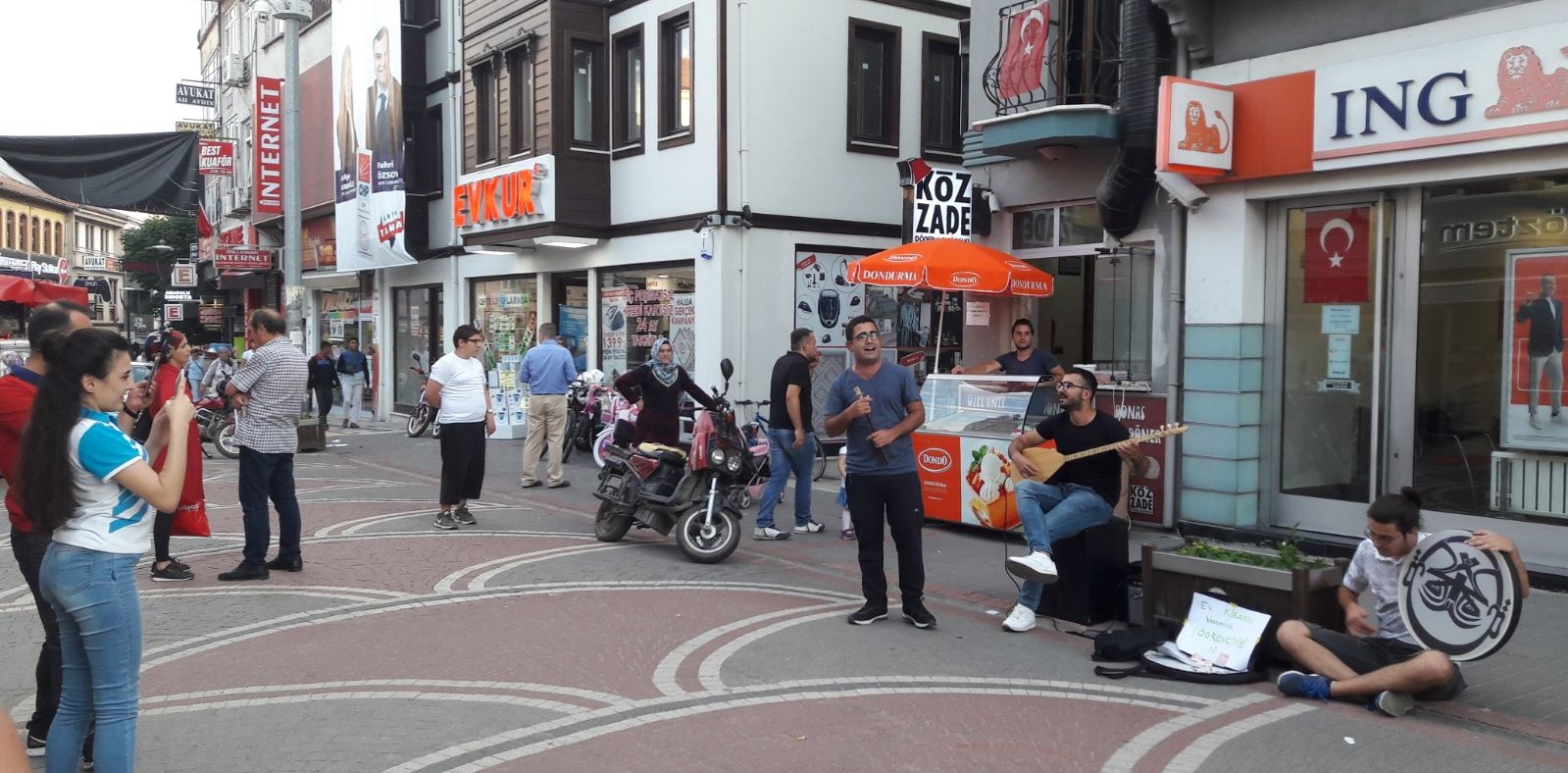 Daha çok İstanbul’un İstiklal Caddesi’nde görmeye alıştığımız görüntülerin bir benzeri dün Bartın’da takıldı objektifimize. Hükümet Caddesi üzeri ING Bank önünde tezgah kuran 3 üniversite öğrencisi; sazıyla, tefiyle, flütüyle hem çaldı hem söyledi.