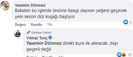 Bartın Milletvekili Yılmaz Tunç’un duyurusunun altına “Bakalım önüme hangi dayının yeğeni geçecek” yorumu yaban Yasemin Dönmez’in yorumuna birinci ağızdan yanıt geldi. Tunç, bu yoruma “Direkt kura ile alınacak, dayı geçerli değil” karşılığı verdi.