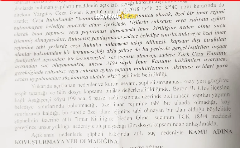 Bartın’ın Ulus ilçesinde “imar kirliliğine neden olmak” suçlamasıyla başlatılan soruşturma, savcılıktan döndü. Savcılık, iddiaları unsur yokluğu nedeniyle yok hükmünde saydı.