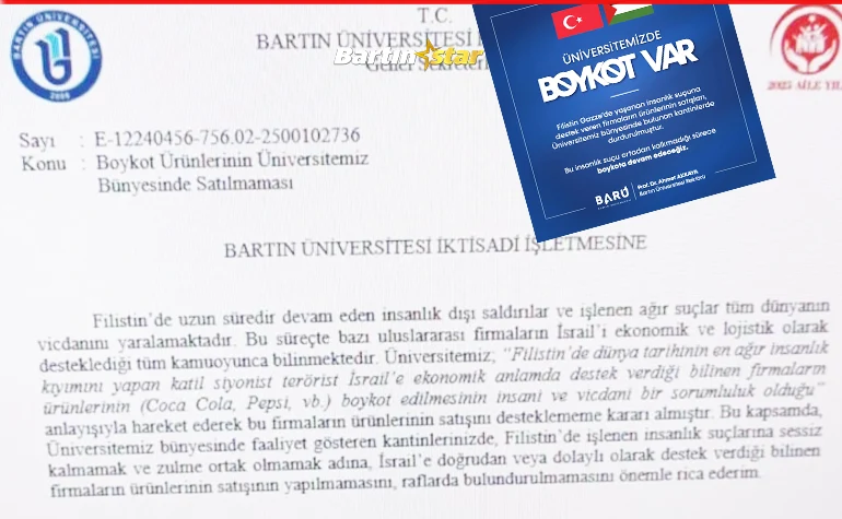 Bartın Üniversitesi (BARÜ) Rektörlüğü, üniversite kantinlerinde İsrail ürünlerine boykot uygulama kararını tüm birimlere iletti. Rektör Prof. Dr. Ahmet Akkaya imzasıyla Bartın Üniversitesi İktisadi İşletmesine gönderilen yazıda, İsrail menşeli ürünlerine boykot uygulama kararı iletildi.