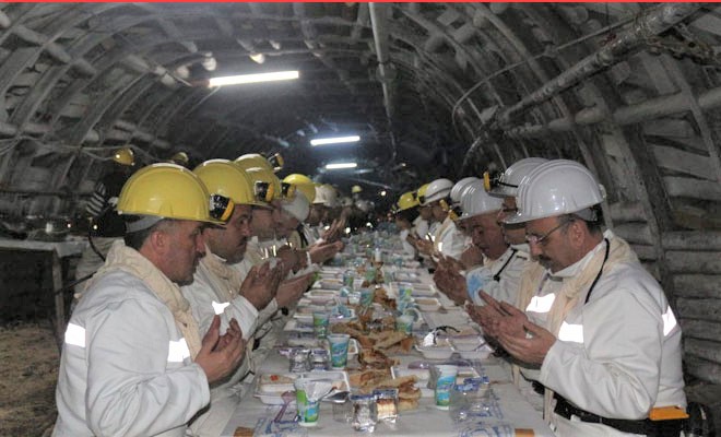 Mönüde; hurma, mercimek çorbası, tas kebabı, pirinç pilavı, tulumba tatlısı ve ayran yer aldı. Talip Uçar’ın iftar duası ardından Vali Sinan Güner, yerin metrelerce altında, alın teri dökerek emek mücadelesi veren maden işçilerine kazasız belasız hayırlı çalışmalar diledi.